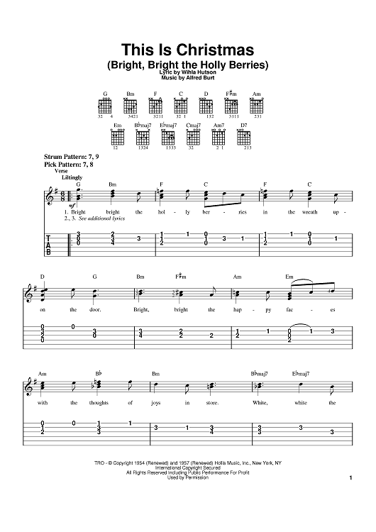 Digital Sheet Music for This Is Christmas (Bright, Bright The Holly Berries) by Alfred Burt, Wihla Hutson scored for Easy Guitar; id:369625