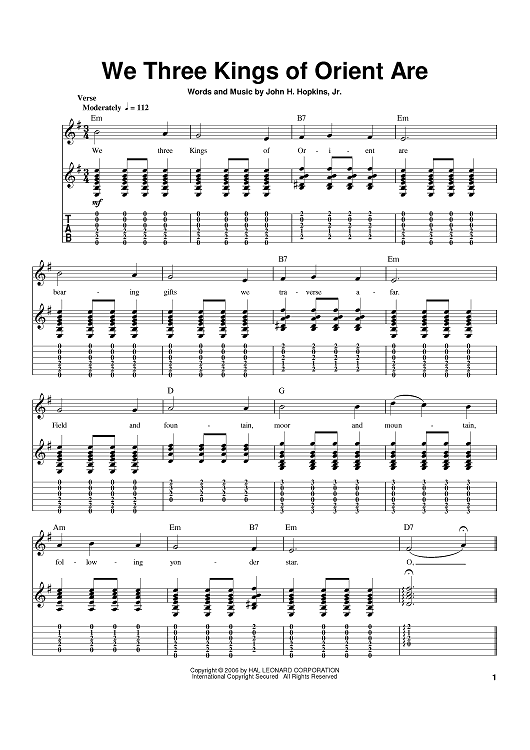 Digital Sheet Music for We Three Kings Of Orient Are by John Henry Hopkins, Jr. scored for Guitar Tab; id:391225