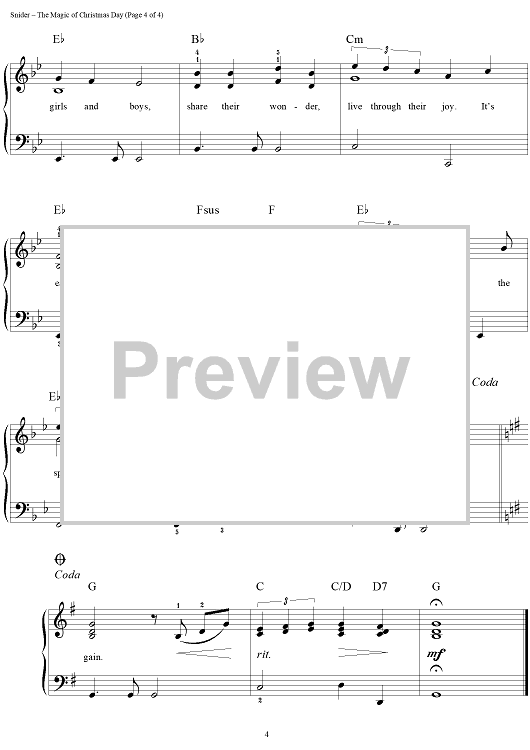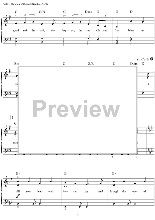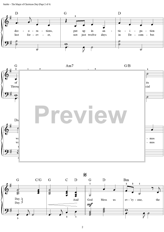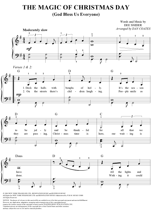Digital Sheet Music for The Magic Of Christmas Day (God Bless Us Everyone) by Dan Coates, Celine Dion, Dee Snider scored for Easy Piano/Vocal/Chords; id:241905