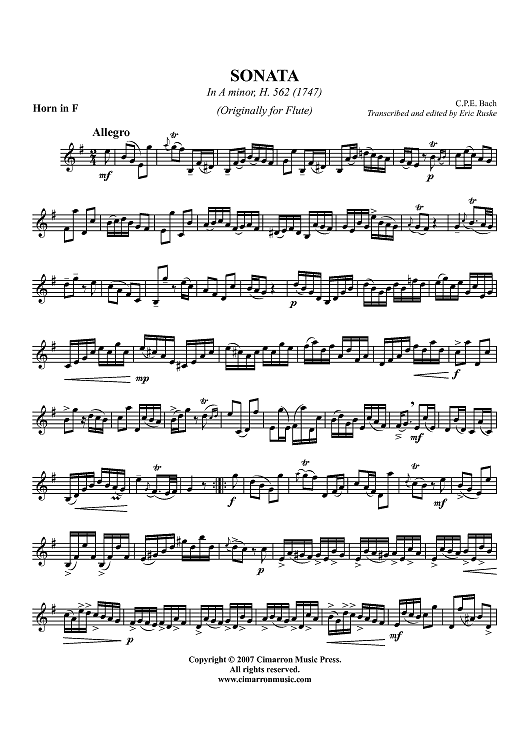 "Sonata in A Minor, H. 562" Sheet Music by Carl Philipp Emanuel Bach