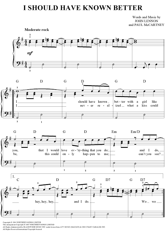 Digital Sheet Music for I Should Have Known Better by Paul McCartney, The Beatles, John Lennon scored for Easy Piano/Vocal/Chords; id:449560