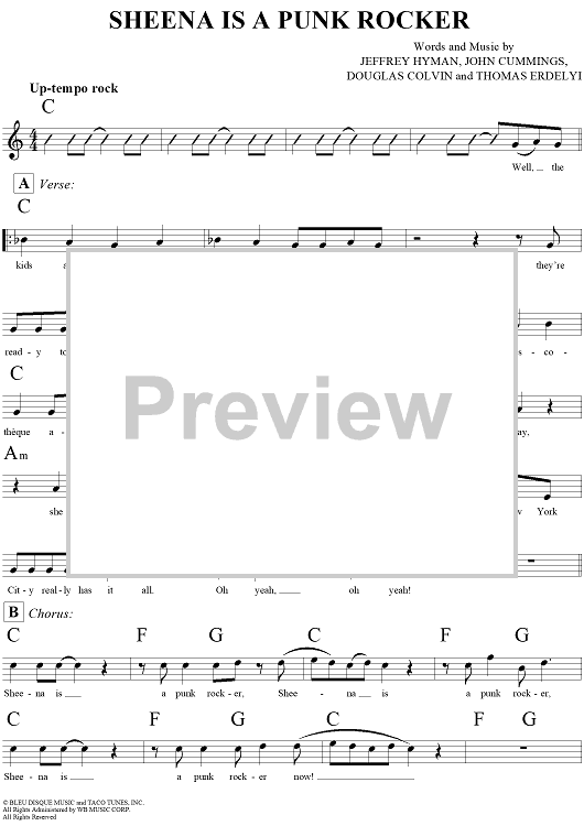 Digital Sheet Music for Sheena Is a Punk Rocker by Douglas Colvin, Thomas Erdelyi, Jeffrey Hyman, John Cummings scored for Lead Sheet; id:293760