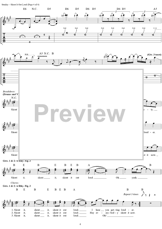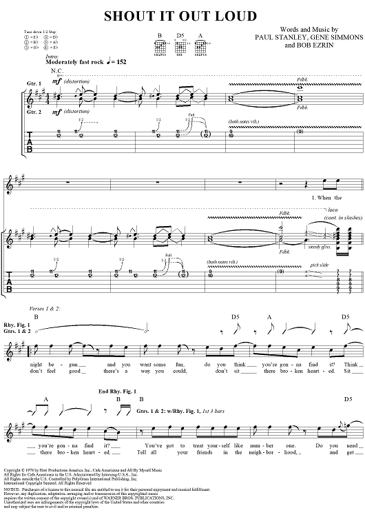 Digital Sheet Music for Shout It Out Loud by Paul Stanley, Bob Ezrin, Gene Simmons, KISS scored for Guitar Tab/Vocal; id:206971