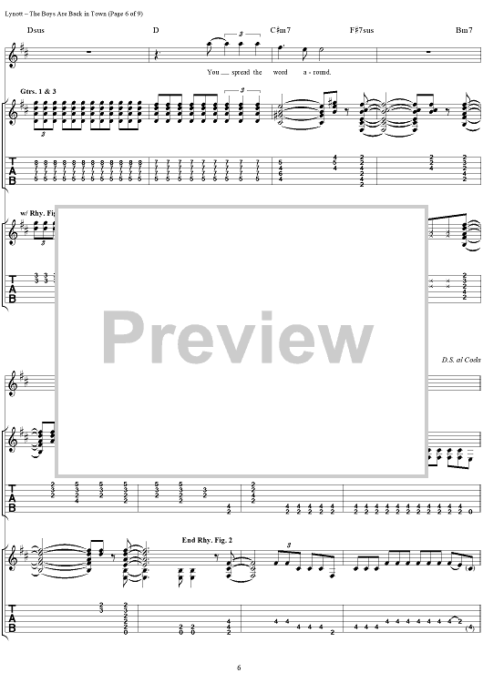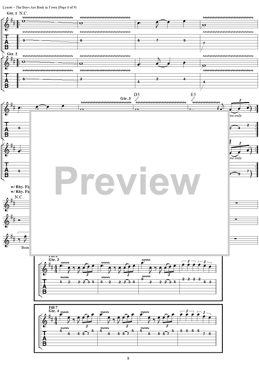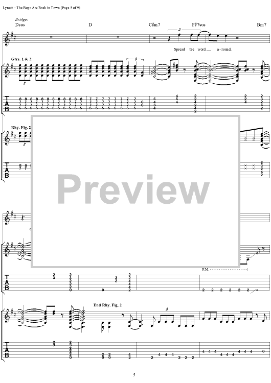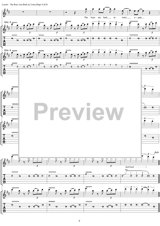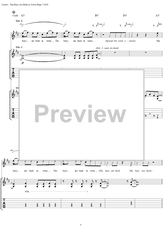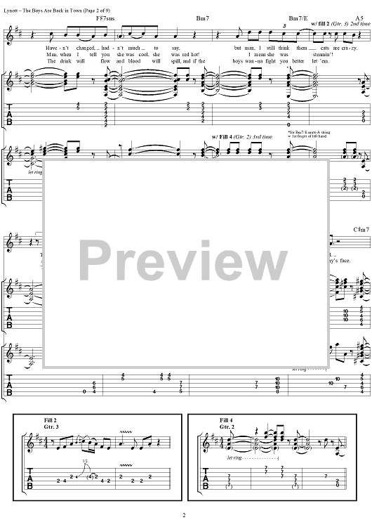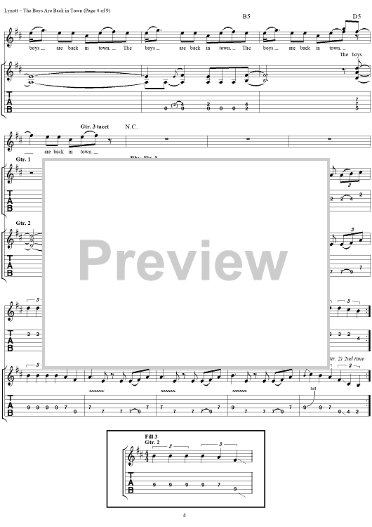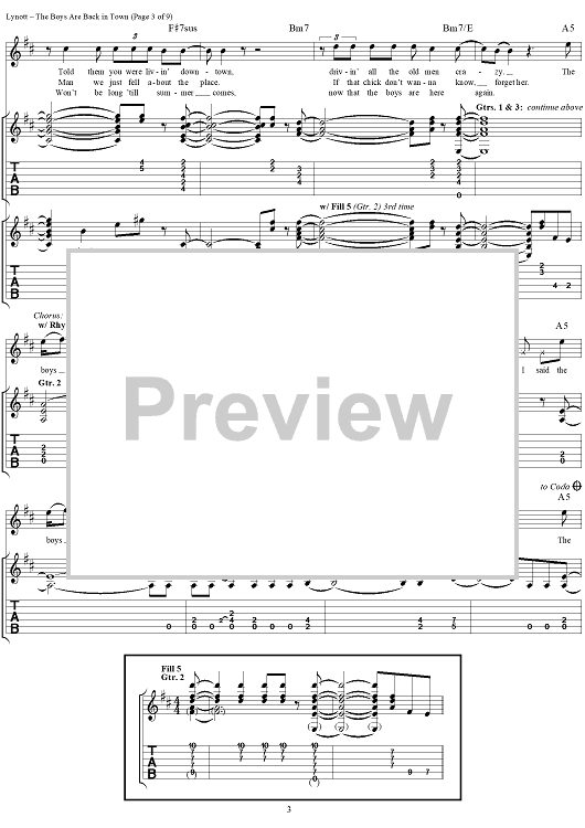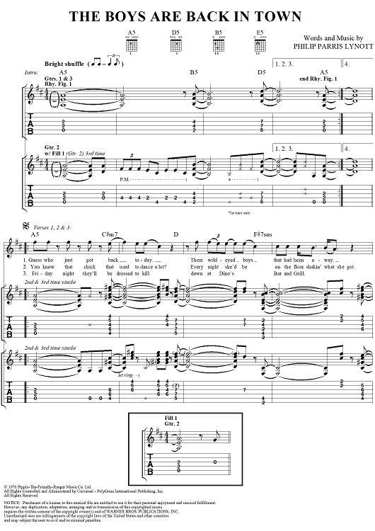 Digital Sheet Music for The Boys Are Back in Town by Thin Lizzy, Philip Parris Lynott scored for Guitar Tab/Vocal; id:225185