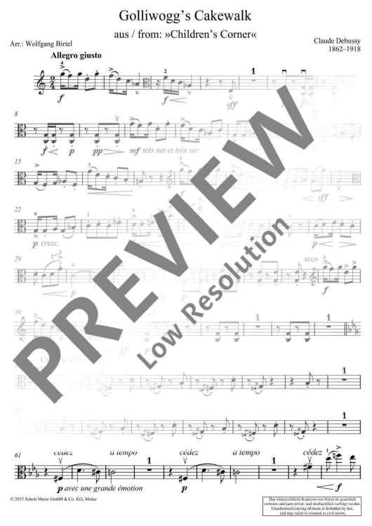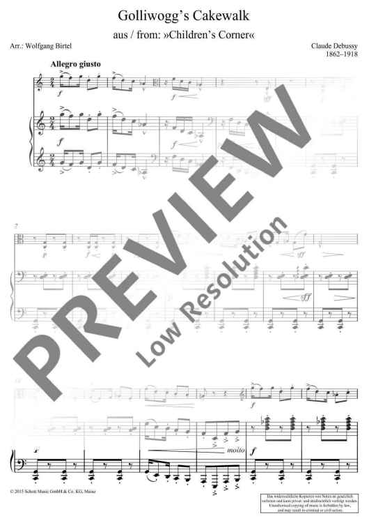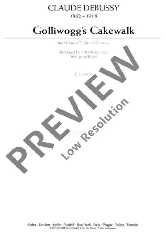 The famous Golliwogg’s Cakewalk is the final piece from Debussy's cycle Children’s Corner which consists of 6 miniatures for piano, written for his daughter in the years 1906-1908. The style corresponds to that of ragtime, a dance which was in vogue around the turn of the century. In the middle section, he parodies several times the beginning of the opera Tristan and Isolde by Richard Wagner with whom Debussy had a rather ambiguous relationship. The present arrangement now allows musicians to play the popular movement in a version for melodic instrument with accompaniment.