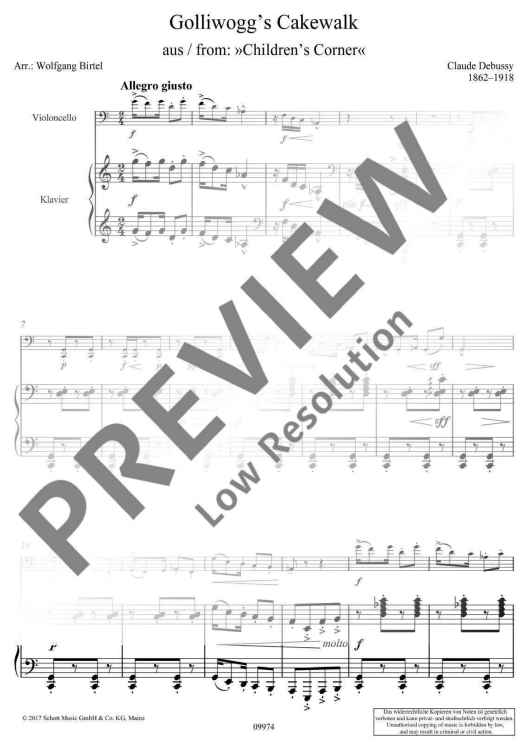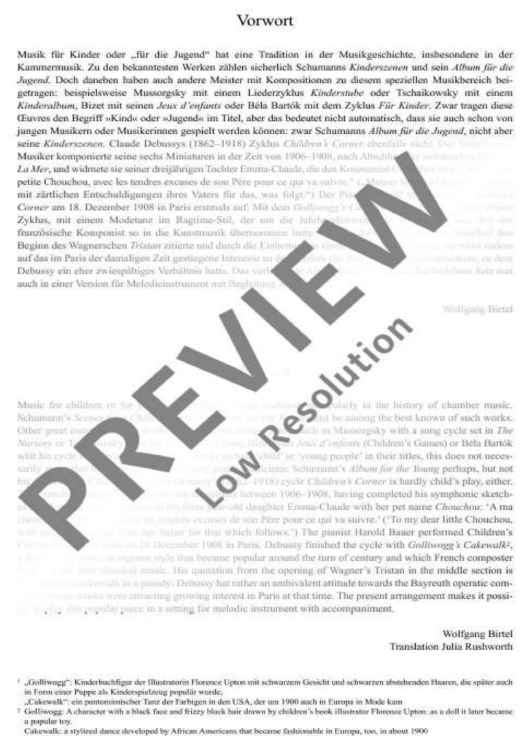 The famous Golliwogg’s Cakewalk is the final piece from Debussy's cycle Children’s Corner which consists of 6 miniatures for piano, written for his daughter in the years 1906-1908. The style corresponds to that of ragtime, a dance which was in vogue around the turn of the century. In the middle section, he parodies several times the beginning of the opera Tristan and Isolde by Richard Wagner with whom Debussy had a rather ambiguous relationship. The present arrangement now allows musicians to play the popular movement in a version for melodic instrument with accompaniment.