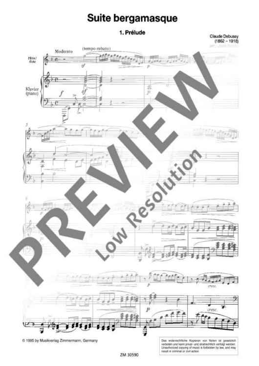 Having worked their way through "Clair de lune", many flutists might be interested in getting to know the entire Suite bergamasque by Claude Debussy; this arrangement for flute and piano tries to fulfill this wish. The edition presented here clearly emphasizes the composer's transparent style of setting.