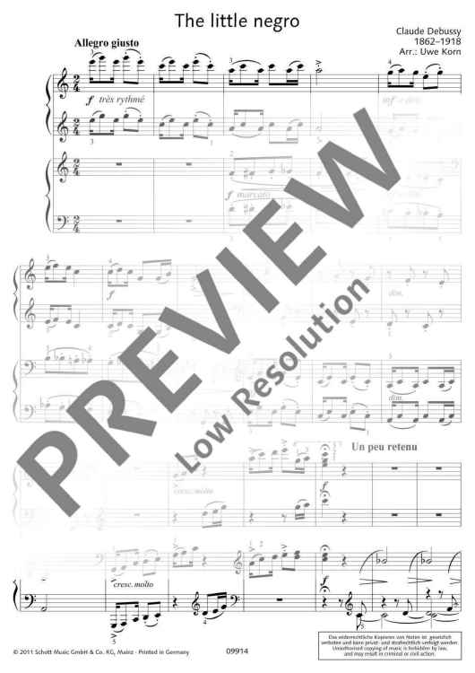 Debussy's famous piano piece 'The little negro' is one of the first classical piano pieces that takes up stylistic elements from jazz music: the then very popular 'Cake Walk' was inspired by Parisian circus artists like the clown Georg Fotitt and his black assistant Chocolat. The popular piece was published in the 'Méthode élémentaire de Piano' by Théodore Lack (for two hands) in 1909. Now it is available in a version for piano duet, easily arranged for lovers of piano duet playing and for tuition.