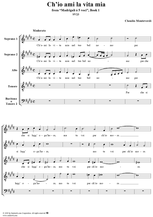 "Ch'io ami la vita mia - From "Madrigali à 5 voci" Book 1 - SV23" Sheet Music by Claudio Monteverdi