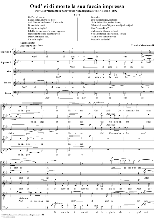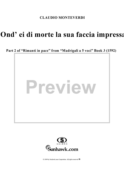 "Ond'ei di morte la sua faccia impressa - Part 2 of "Rimanti in pace" from "Madrigali à 5 voci" Book 3 (1592) - SV74" Sheet Music by Claudio Monteverdi