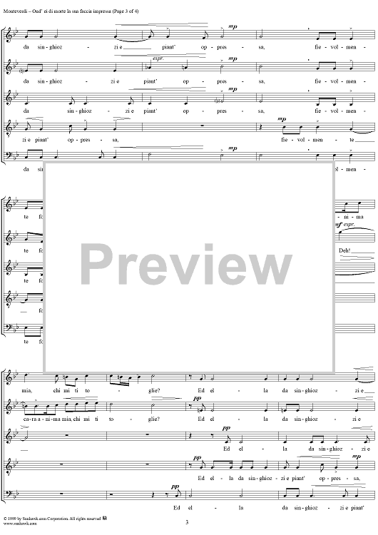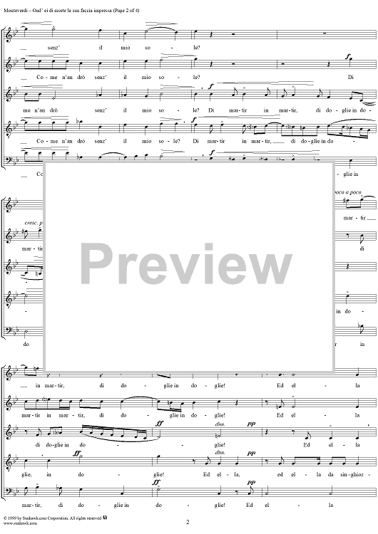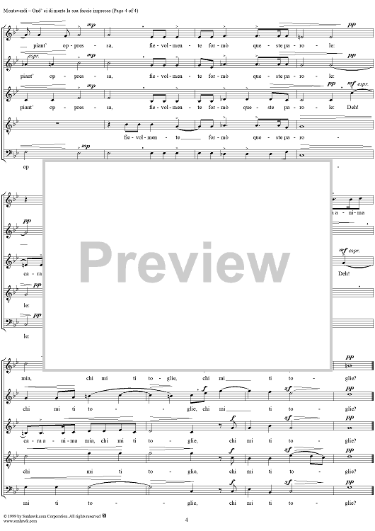 Digital Sheet Music for Ond'ei di morte la sua faccia impressa - Part 2 of "Rimanti in pace" from "Madrigali à 5 voci" Book 3 (1592) - SV74 by Claudio Monteverdi scored for Four-part Mixed Chorus; id:253124