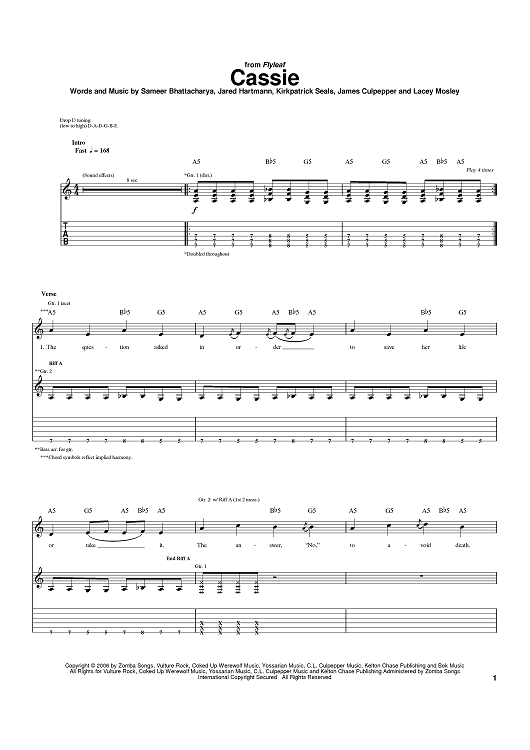 Digital Sheet Music for Cassie by Sameer Bhattacharya, James Culpepper, Flyleaf, Jared Hartmann, Lacey Mosley, Kirkpatrick Seals scored for Guitar Tab; id:395104