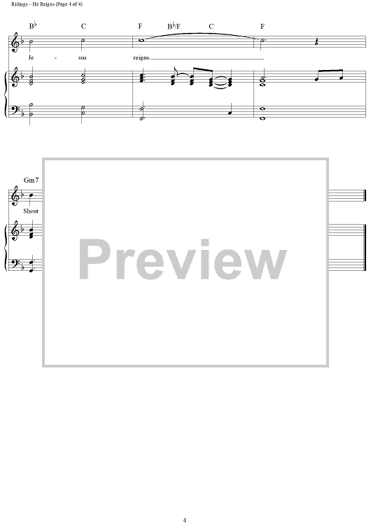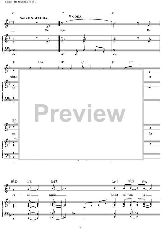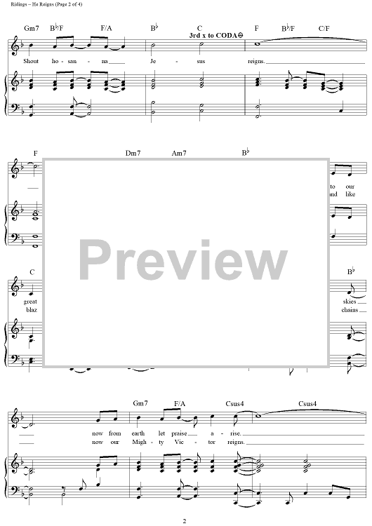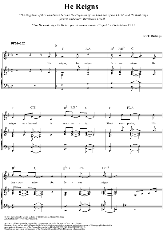 Digital Sheet Music for He Reigns by Rick Ridings scored for Piano/Vocal/Chords; id:109203