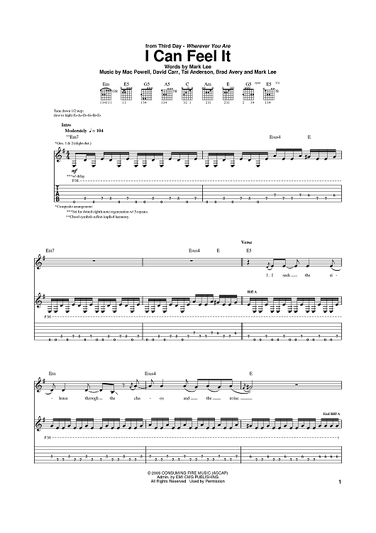 Digital Sheet Music for I Can Feel It by Third Day, Mac Powell, Mark David Lee, Tai Anderson, Brad Avery, David Carr scored for Guitar Tab; id:388582