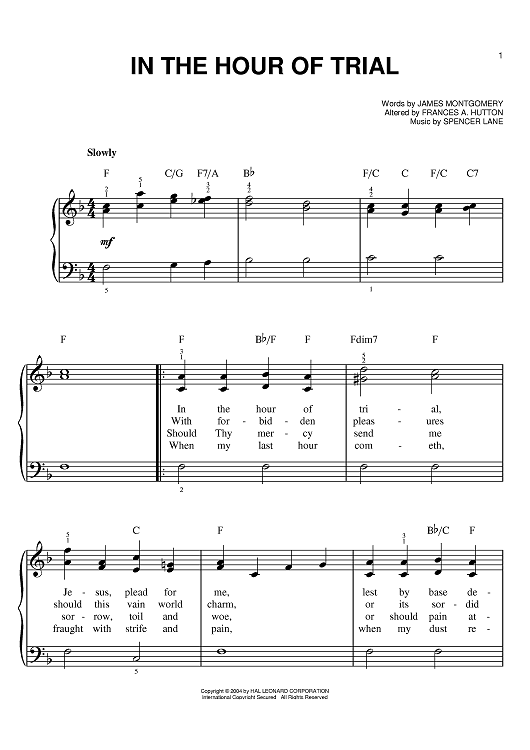 Digital Sheet Music for In The Hour Of Trial by James Montgomery, Frances A. Hutton, Spencer Lane scored for Easy Piano; id:381091