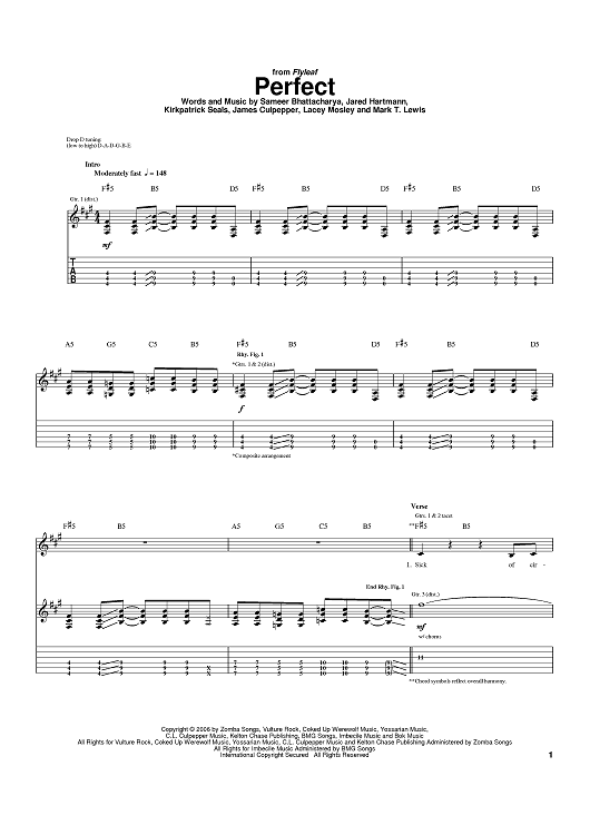 Digital Sheet Music for Perfect by Sameer Bhattacharya, James Culpepper, Flyleaf, Jared Hartmann, Mark T. Lewis, Lacey Mosley, Kirkpatrick Seals scored for Guitar Tab; id:395106