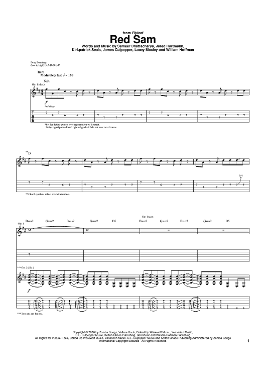 Digital Sheet Music for Red Sam by Sameer Bhattacharya, James Culpepper, Flyleaf, Jared Hartmann, William Hoffman, Lacey Mosley, Kirkpatrick Seals scored for Guitar Tab; id:395108