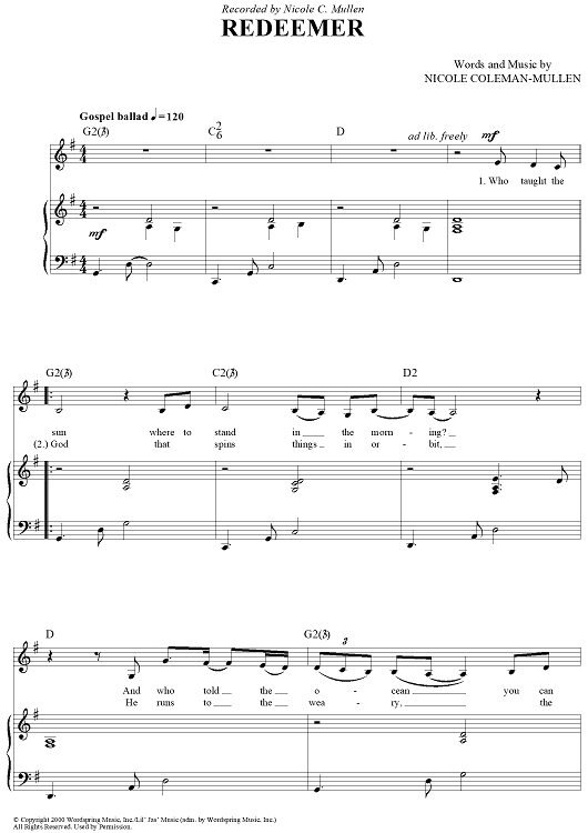 "Redeemer" Sheet Music by Nicole C. Mullen