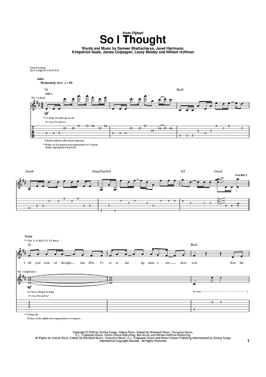 Digital Sheet Music for So I Thought by Sameer Bhattacharya, James Culpepper, Flyleaf, Jared Hartmann, William Hoffman, Lacey Mosley, Kirkpatrick Seals scored for Guitar Tab; id:395107