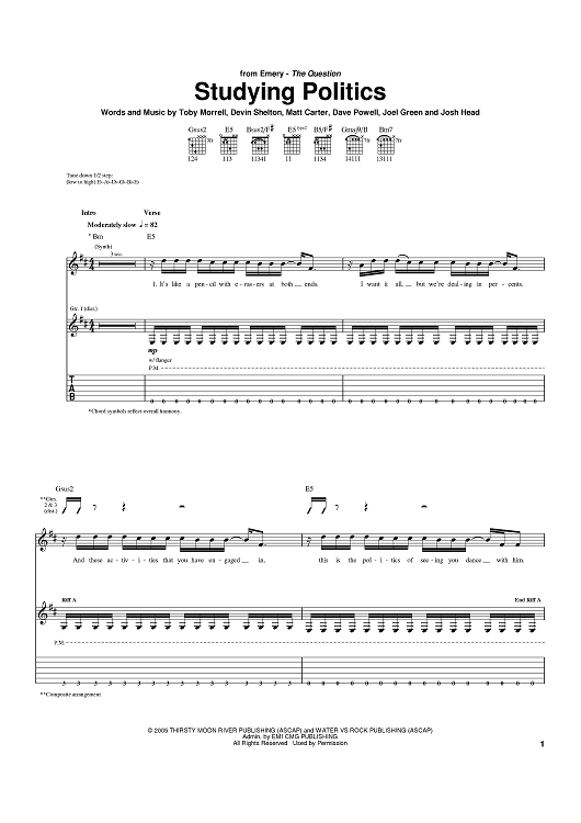 Digital Sheet Music for Studying Politics by Matt Carter, Emery, Joel Green, Josh Head, Toby Morrell, Dave Powell, Devin Shelton scored for Guitar Tab; id:390244