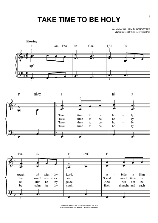 Digital Sheet Music for Take Time To Be Holy by George C. Stebbins, William D. Longstaff scored for Easy Piano; id:381122