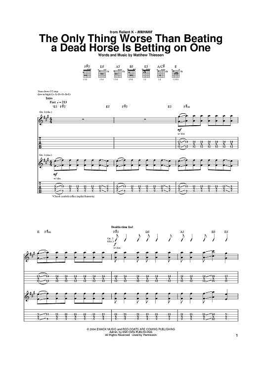 Digital Sheet Music for The Only Thing Worse Than Beating A Dead Horse Is Betting On One by Relient K, Matt Thiessen scored for Guitar Tab; id:384408