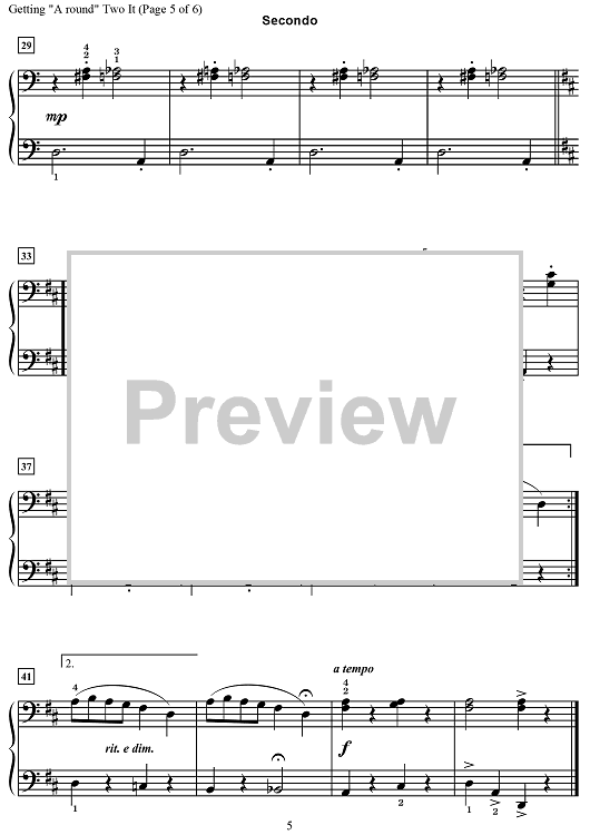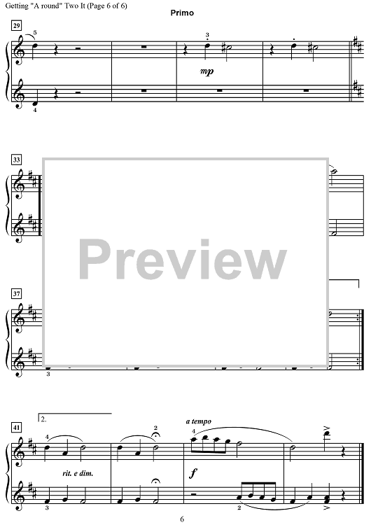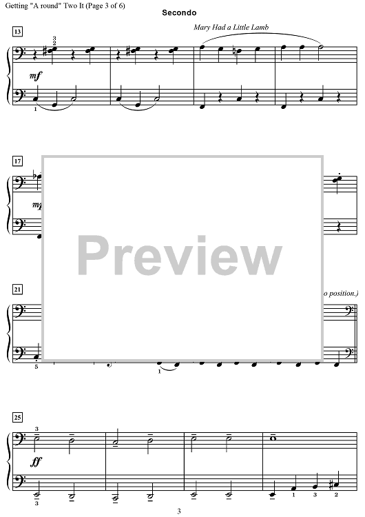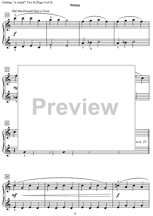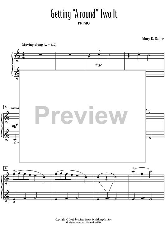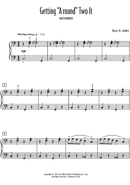 Most students have sung or played familiar musical tunes in rounds. Now, with Getting A "round" Two It, students can delight in hearing these songs in a whole new light! This duet, written in C major and 4/4 meter, uses both primo and secondo to overlap, twist and stylize classics such as "Brother John," "Mary Had a Little Lamb," and "Old MacDonald Had a Farm" into an entirely new and creative performance piece. Adding extra flair to this showstopper is a clever switch in parts (featuring the performers swapping places on the piano bench) that will leave the audience shouting for an encore!
