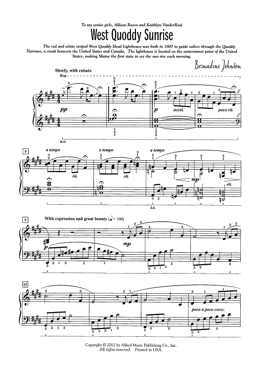 Magnificent Maine celebrates the unique features of the state of Maine and its coastline. "West Quoddy Sunrise" opens the suite with a musical depiction of a gorgeous sunrise over the West Quoddy Head Lighthouse. Filled with a sense of wonder and beauty, this expressive movement is lyrical from the first note to the last. The jagged coastline is depicted in the second movement, "The Rocky Coast." Intense dynamics and large chords outline the rocks and waves that crash upon them. The third movement, "Magnificent Pines," concludes the suite with majestic chords and a full, rich sound that befits the state known as "The Pine Tree State." "West Quoddy Sunrise" is a Federation Festivals 2016-2020 selection.