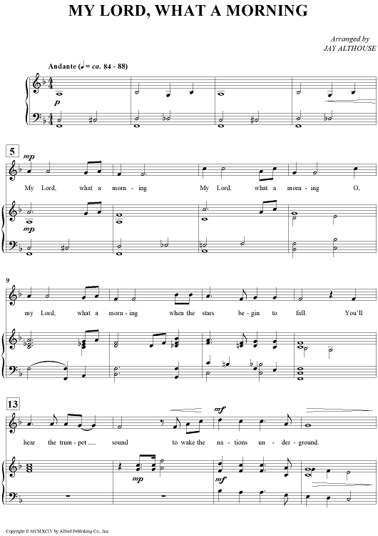 Digital Sheet Music for My Lord, What A Morning by Spiritual, Jay Althouse scored for Piano/Vocal; id:440966
