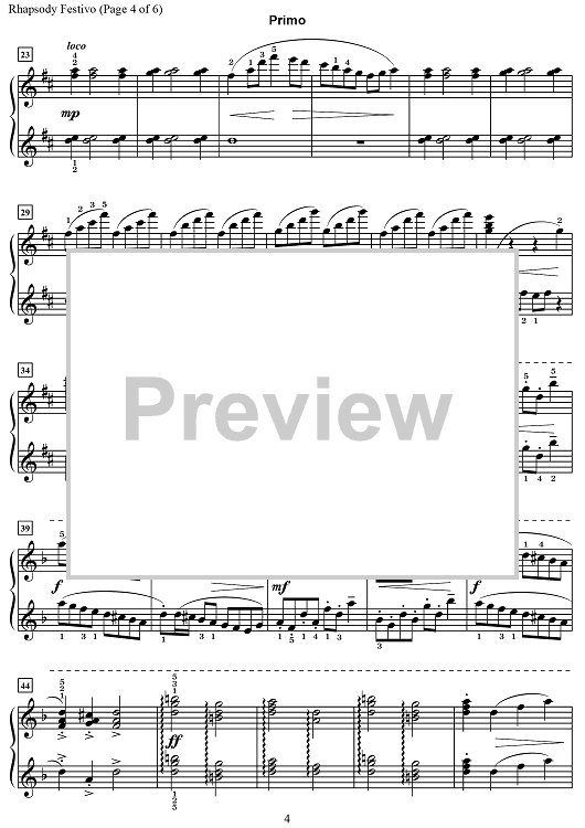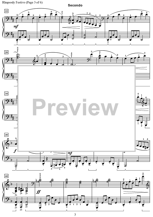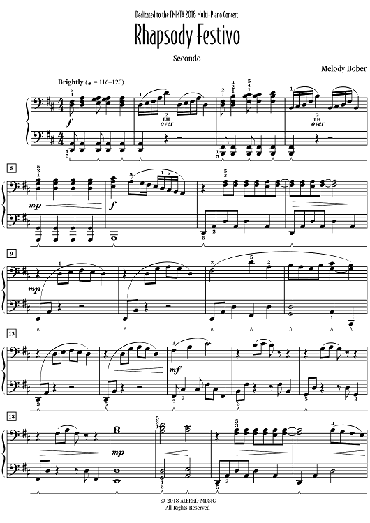 Rhapsody Festivo was commissioned by the Fargo, Minnesota Music Teachers Association for the 2018 Multi-Piano Concert. The Romantic-style piece is dramatic in the opening section, with big chords and soaring lyrical melodies. The middle section features scale figures and staccato broken chords that provide a contrast to the opening and closing sections. The ending has rhythmic surprises and closes with a descending chromatic scale in the secondo that supports the chords found in the primo.