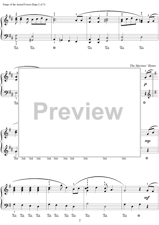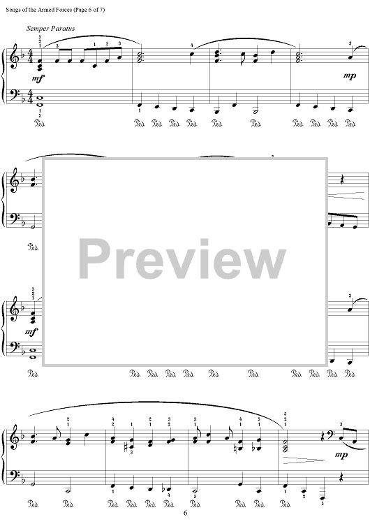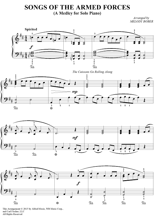The United States Armed Forces are divided into five branches: the Army, Marine Corps, Navy, Air Force, and Coast Guard. This collection contains the official songs of these branches, as well as a special concert-worthy medley that combines them. The solo piano arrangements are written in singable keys and contain lyrics, which make them perfect for sing-alongs. They can also be performed for school talent shows, community celebrations, homecomings, and pageants. Titles: The Caissons Go Rolling Along (aka "The Army Goes Rolling Along") * The Marines' Hymn (aka "From the Halls of Montezuma") * Anchors Aweigh * The U.S. Air Force (aka "The Wild Blue Yonder") * Semper Paratus (Always Ready) * Songs of the Armed Forces (A Medley for Solo Piano). "The Caissons Go Rolling Along" and "The U.S. Air Force" are Federation Festivals 2016-2020 selections.