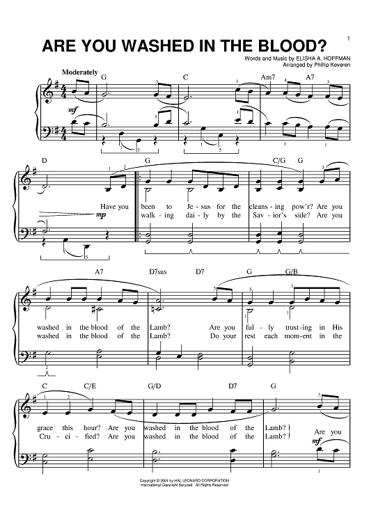 Digital Sheet Music for Are You Washed In The Blood? by Elisha A. Hoffman, Phillip Keveren scored for Easy Piano; id:382213