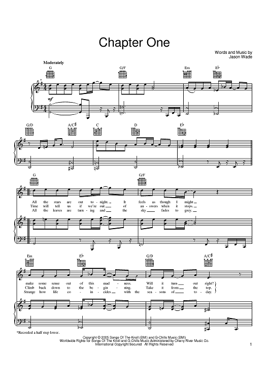 Digital Sheet Music for Chapter One by Jason Wade, Lifehouse scored for Piano/Vocal/Chords; id:389889
