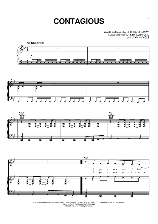 Digital Sheet Music for Contagious by Chrissy Conway, Alisa Girard, Kristin Swinford, ZOEgirl scored for Piano/Vocal/Chords; id:373161