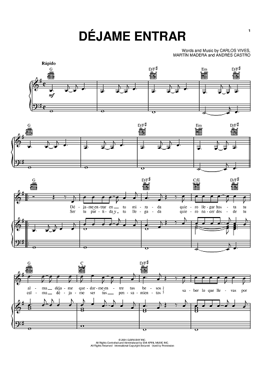 Digital Sheet Music for Déjame Entrar by Andres Castro, Martin Madera, Carlos Vives scored for Piano/Vocal/Chords; id:370436