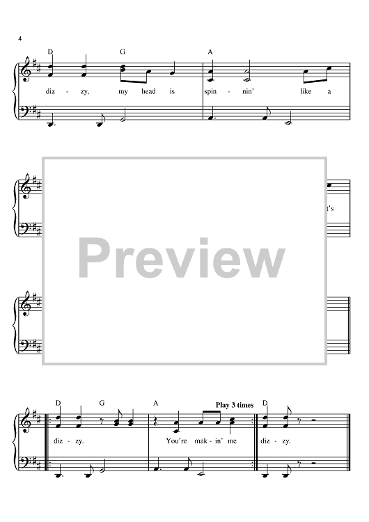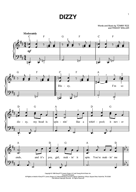 Digital Sheet Music for Dizzy by Freddy Weller, Tommy Roe scored for Easy Piano; id:369240