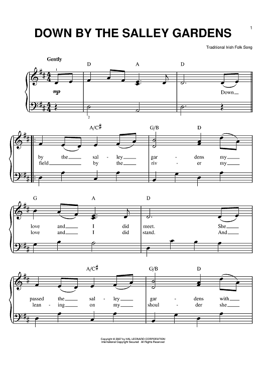 Digital Sheet Music for Down By The Salley Gardens by scored for Easy Piano; id:397284