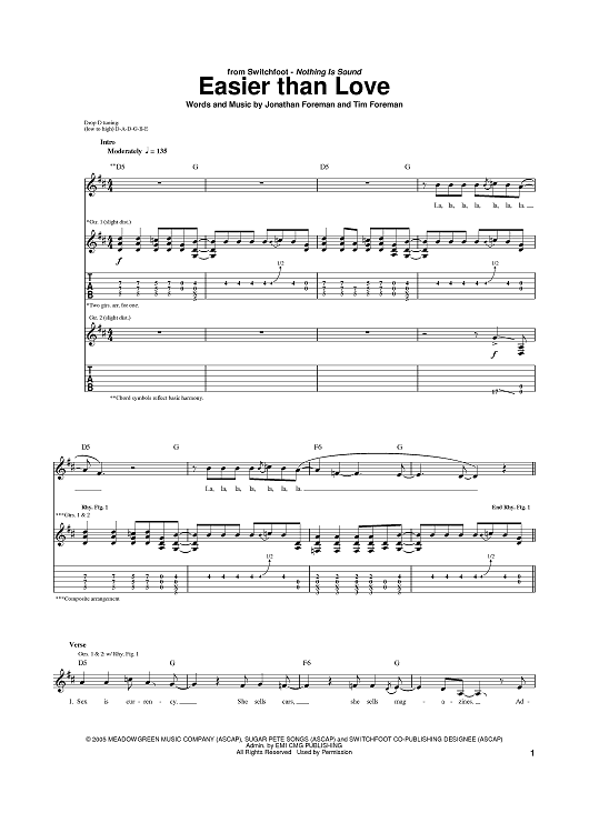 Digital Sheet Music for Easier Than Love by Jonathan Mark Foreman, Switchfoot, Tim Foreman scored for Guitar Tab; id:387257
