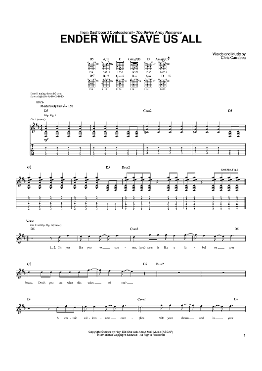 Digital Sheet Music for Ender Will Save Us All by Chris Carrabba, Dashboard Confessional scored for Guitar Tab; id:391079