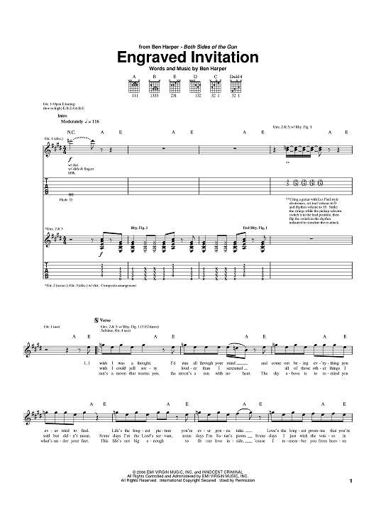 Digital Sheet Music for Engraved Invitation by Ben Harper scored for Guitar Tab; id:390080