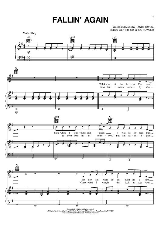 Digital Sheet Music for Fallin' Again by Greg Fowler, Randy Owen, Teddy Gentry, Alabama scored for Piano/Vocal/Chords; id:389754