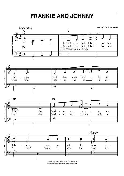 Digital Sheet Music for Frankie And Johnny by scored for Easy Piano; id:373886