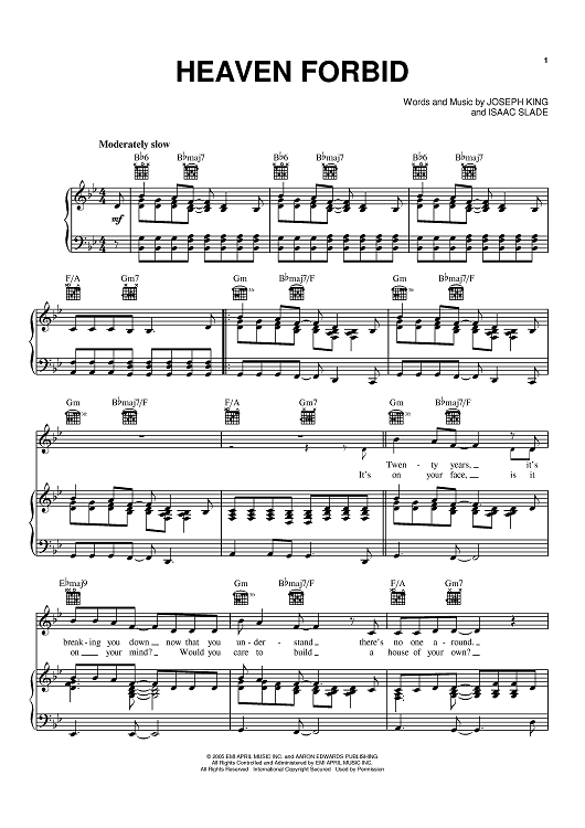 Digital Sheet Music for Heaven Forbid by Joseph King, Isaac Slade, The Fray scored for Piano/Vocal/Chords; id:391721