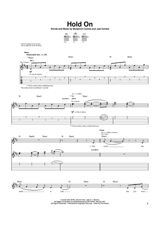 Digital Sheet Music for Hold On by Benji Madden, Joel Madden, Good Charlotte scored for Guitar Tab; id:371013