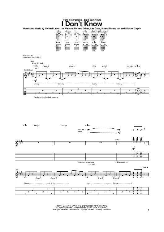 Digital Sheet Music for I Don't Know by Michael Lewis, Lostprophets, Richard Oliver, Ian Watkins scored for Guitar Tab; id:374979