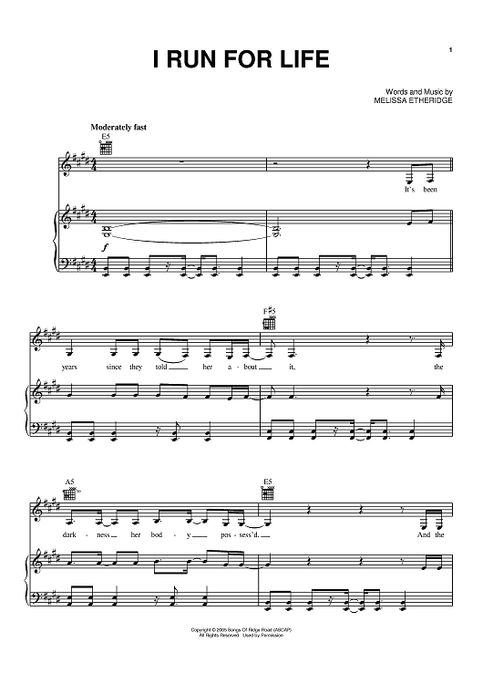 Digital Sheet Music for I Run For Life by Melissa Etheridge scored for Piano/Vocal/Chords; id:388611