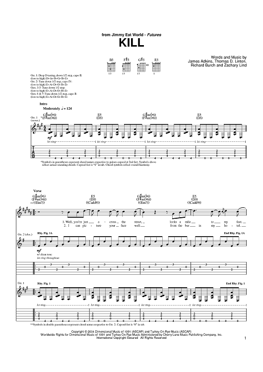 Digital Sheet Music for Kill by James Adkins, Richard Burch, Jimmy Eat World, Zachary Lind, Tom Linton scored for Guitar Tab; id:387765