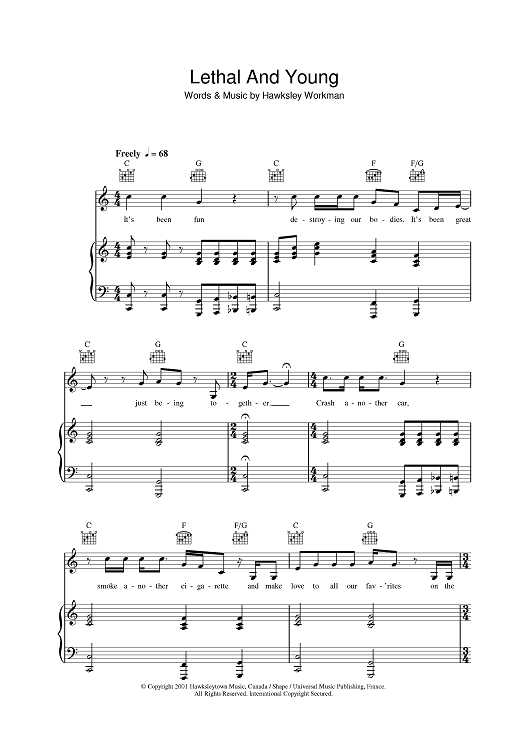Digital Sheet Music for Lethal And Young by Hawksley Workman scored for Piano/Vocal/Chords; id:390339