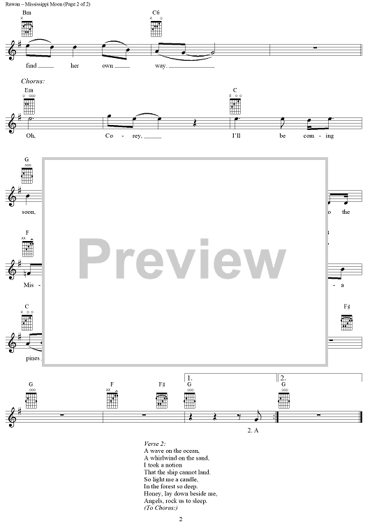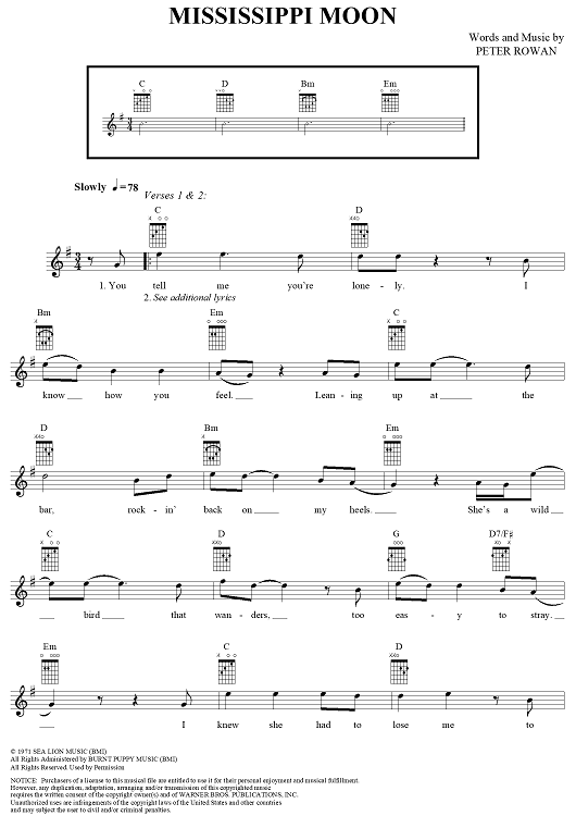 Digital Sheet Music for Mississippi Moon by Jerry Garcia, Peter Rowan scored for Easy Guitar/Vocal; id:291650