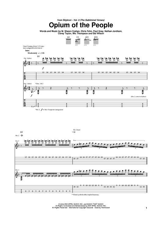 Digital Sheet Music for Opium Of The People by Shawn Crahan, Chris Fehn, Paul Gray, Joey Jordison, Slipknot, Corey Taylor, Mic Thompson, Sid Wilson scored for Guitar Tab; id:379163